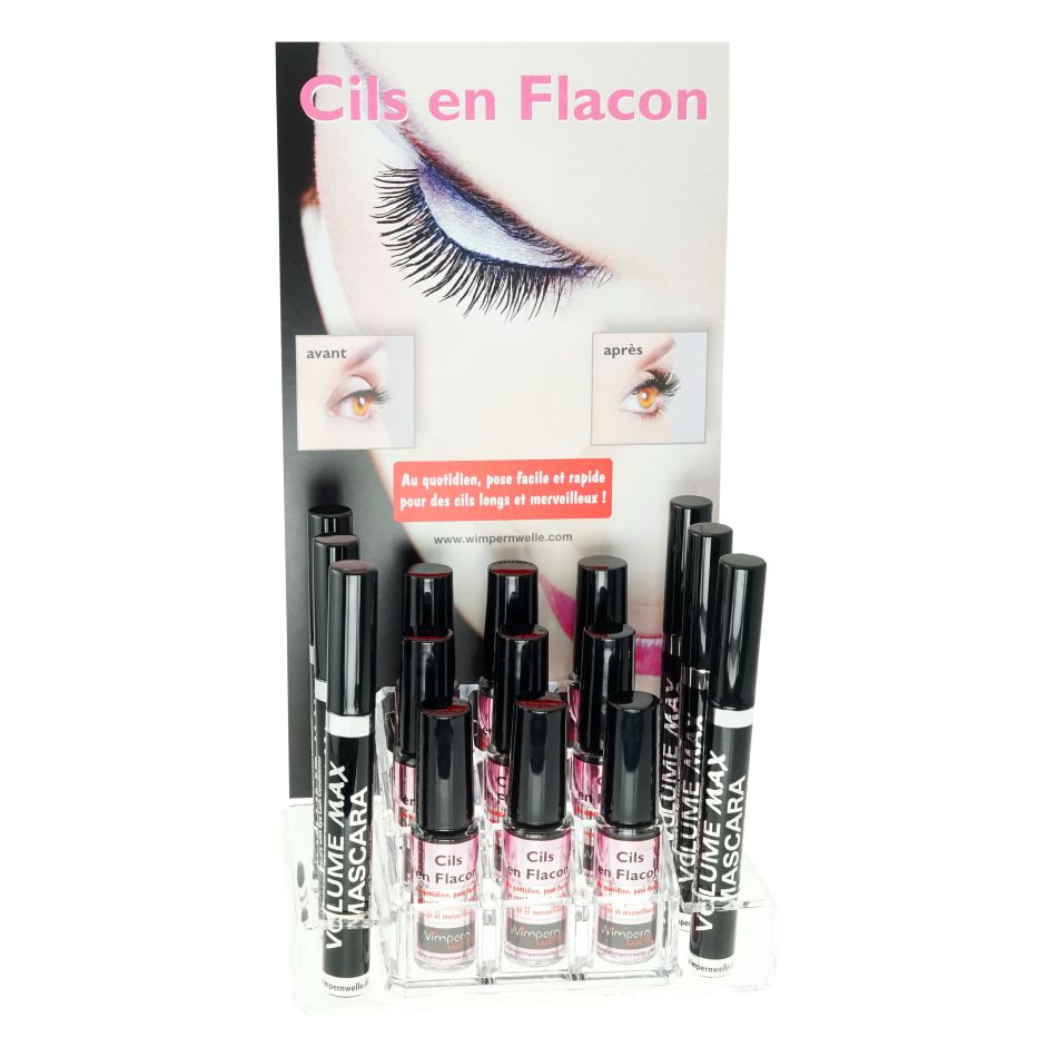 1x Présentoir en acrylique avec paroi arrière, 12 x Cils en flacon et testeurs: 1 x Cils en flacon et 1 x VOLUME MAX Mascara 2.0 ainsi que 1 x Poster et mode d'emploi Cils en flacon
