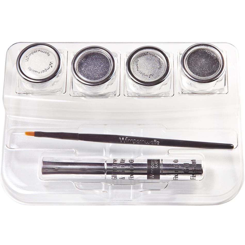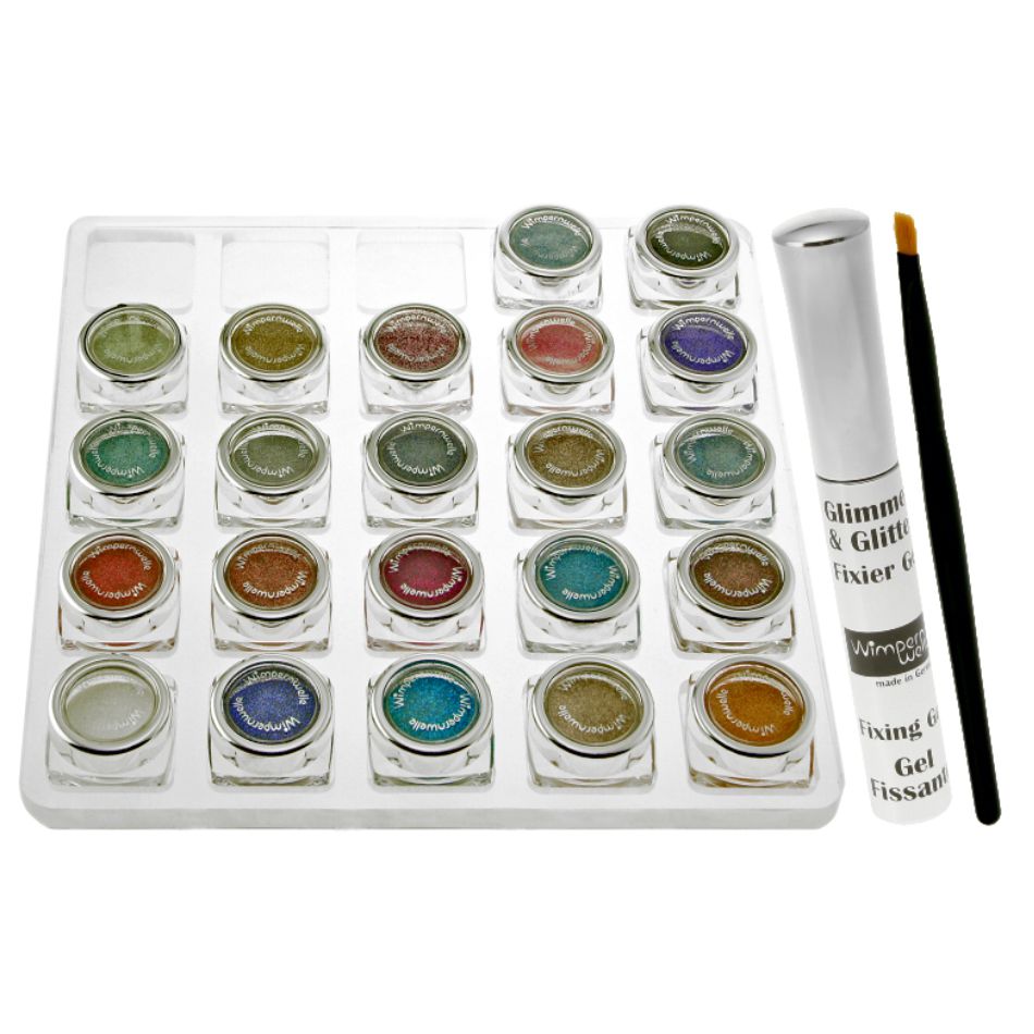 1 x Tableau de maquillage (en acrylique) avec 22 Glimmer & Glitter Fards à paupières, 1 x Gel fixateur, 1 x Pinceau, 1 x Poster