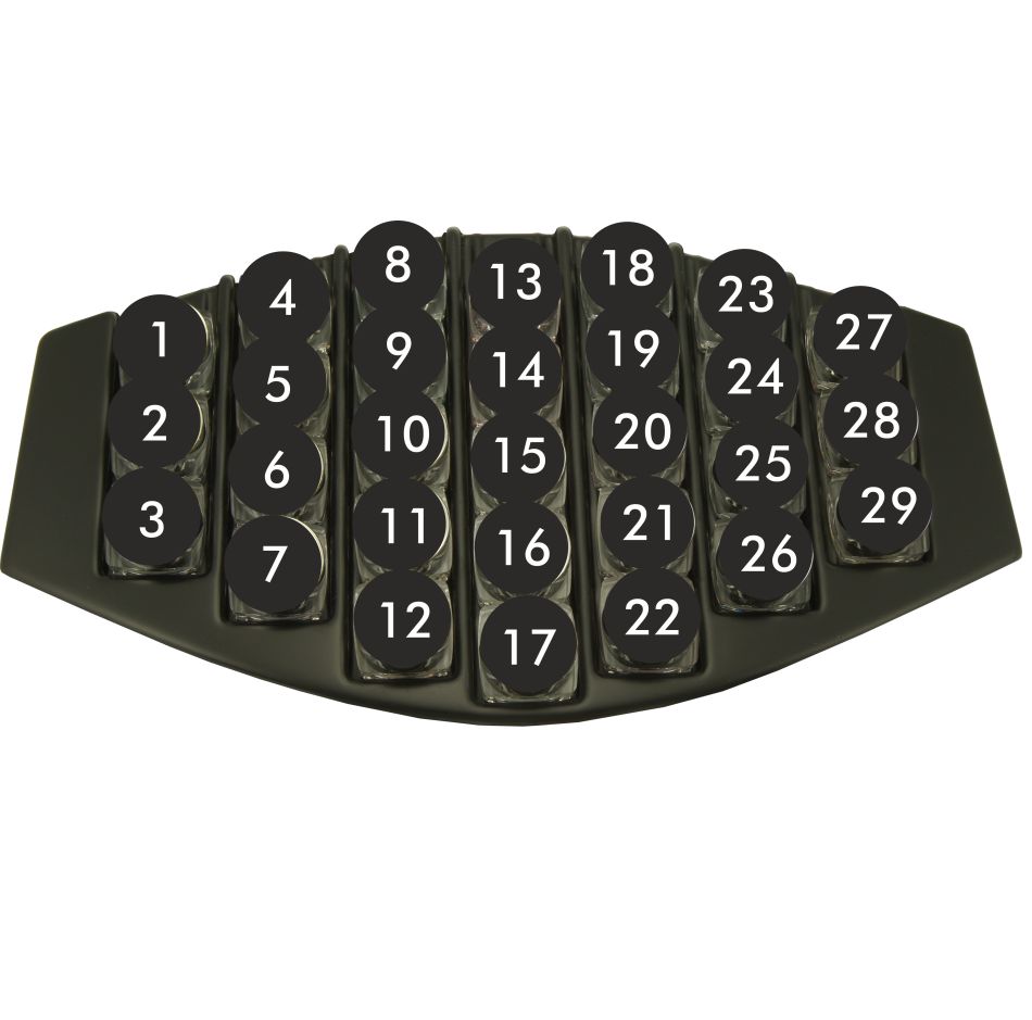 29 x GLIMMER & GLITTER Fards à paupières en 7 couleurs: 5 x Blanc neige, 5 x Gris platine, 5 x Brun, 4 x Sable, 4 x Rosé, 3 x Noir, 3 x Argent