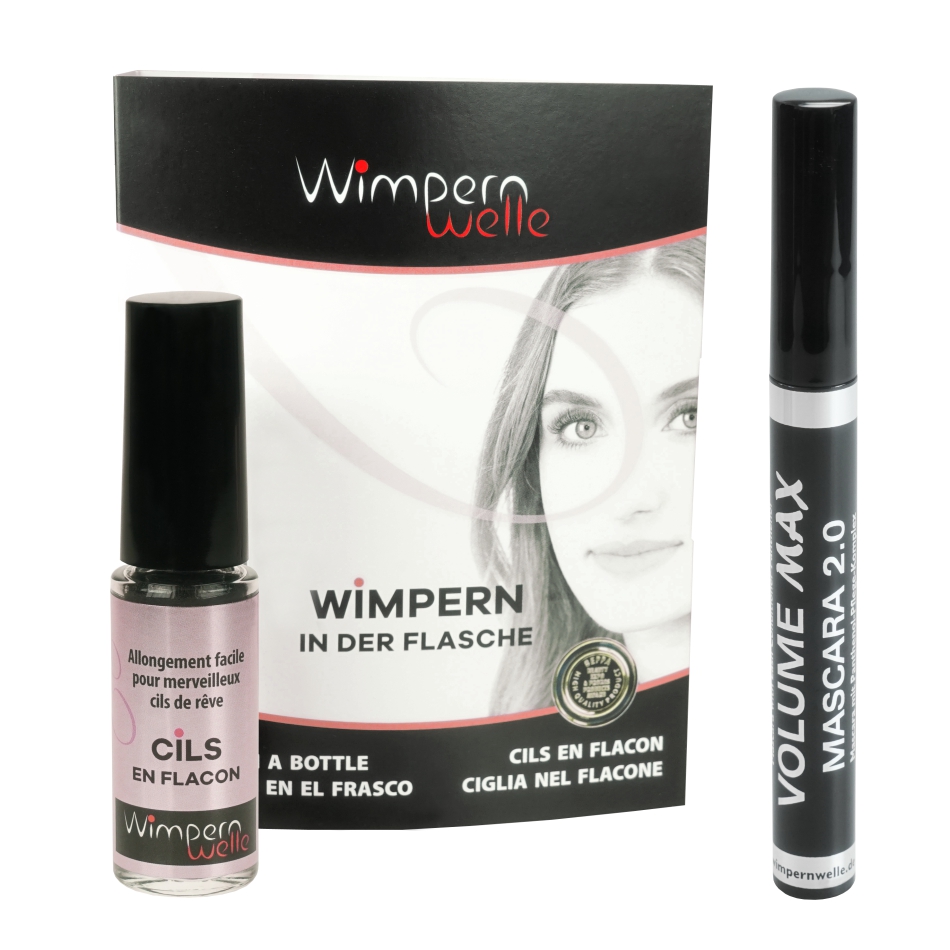 1 x PRE-Mascara, 1 x VOLUME MAX Mascara 2.0 et 1 x Cils en flacon dans un sac cosmétique
